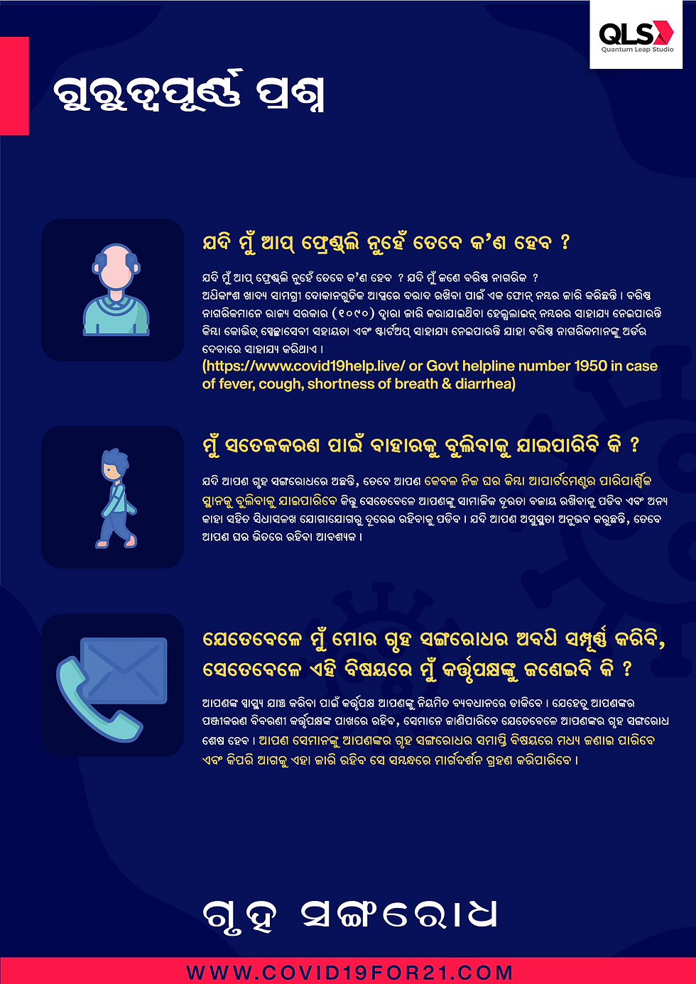 ଓଡ଼ିଶାରେ ଲୋକମାନଙ୍କ ପାଇଁ ୭ ଦିନିଆ ଆନୁଷ୍ଠାନିକ ସଙ୍ଗରୋଧ ବାଧ୍ୟତାମୂଳକ | ଏହା ପରେ, ସାମାନ୍ୟ ଲକ୍ଷଣ ଥିବା ସଂକ୍ରମଣ ରୋଗୀମାନଙ୍କୁ ବାଧ୍ୟତାମୂଳକ ସଙ୍ଗରୋଧରୁ ଯିବା ପାଇଁ ଅନୁମତି ପ୍ରଦାନ କରାଯାଏ, କିନ୍ତୁ ସେମାନେ ଗୃହ ସଙ୍ଗରୋଧରେ ୭ ଦିନ ରହିବା ଆବଶ୍ୟକ | ସେ ଯାହା ହେଉ, ସହରାଞ୍ଚଳରେ ବିଦେଶରୁ ଫେରିଥିବା ବ୍ୟକ୍ତିମାନେ ୧୪ ଦିନ ଗୃହ ସଙ୍ଗରୋଧରେ ରହିବା ଆବଶ୍ୟକ | ଏହି ବିଦେଶୀ ଫେରନ୍ତାମାନେ ସ୍ୱୟଂ ପୃଥକ ରହିବା ଆବଶ୍ୟକ | ଘରେ ଅଲଗା ହୋଇ ରହିବେ, ଲକ୍ଷଣ ଦେଖାଯିବା ମାତ୍ରେ ସ୍ୱାସ୍ଥ୍ୟ ସେବା ନେବା ଆବଶ୍ୟକ | ୧୦୪ ର ପ୍ରତିନିଧିମାନେ ସେମାନଙ୍କୁ ସେମାନଙ୍କ ପଞ୍ଜିକୃତ ନମ୍ବରରେ ଯୋଗାଯୋଗ କରିବେ ଏବଂ ତାଙ୍କର ସ୍ୱାସ୍ଥ୍ୟବସ୍ଥା ବିଷୟରେ ପଚାରି ବୁଝିବେ |